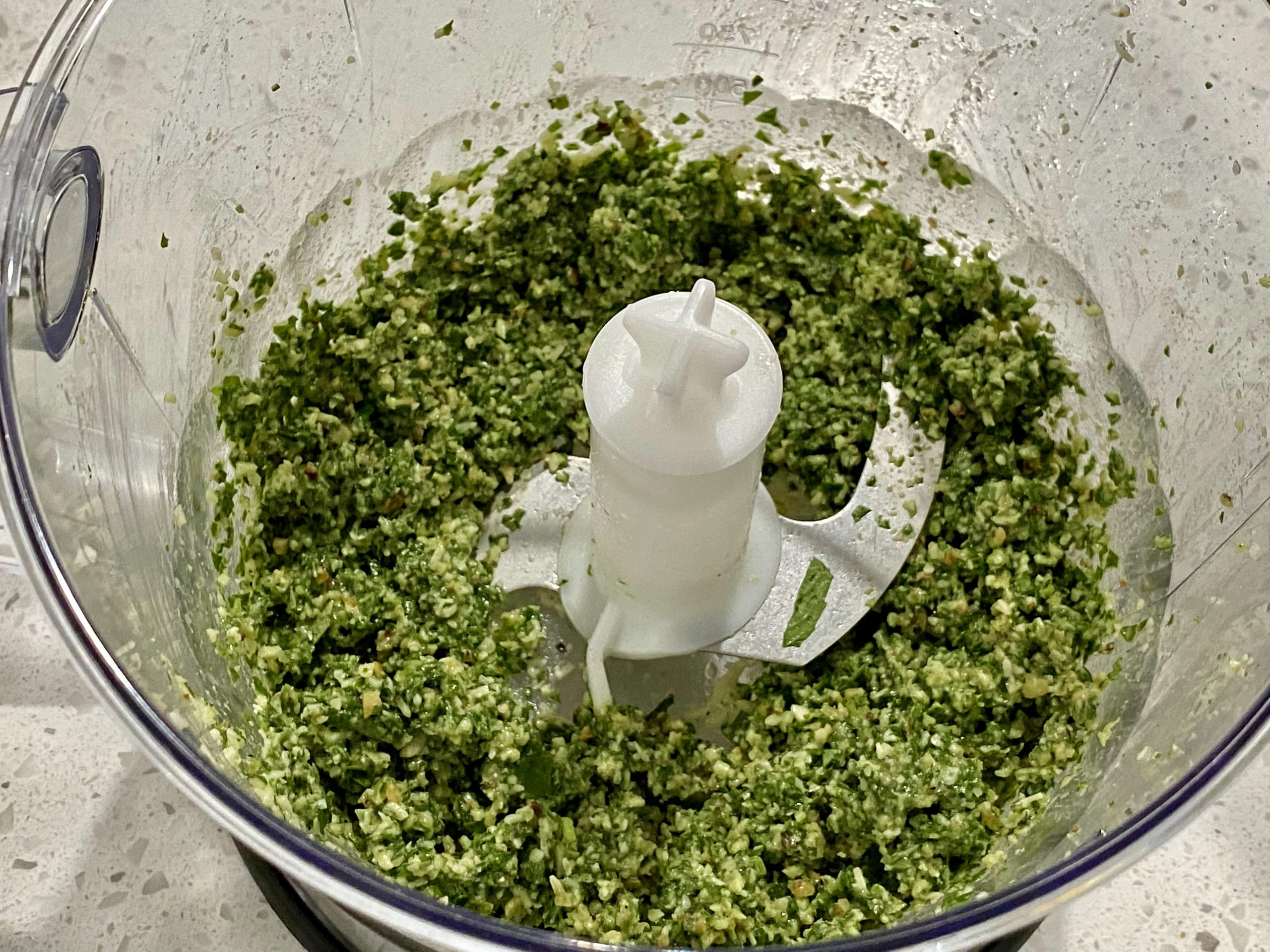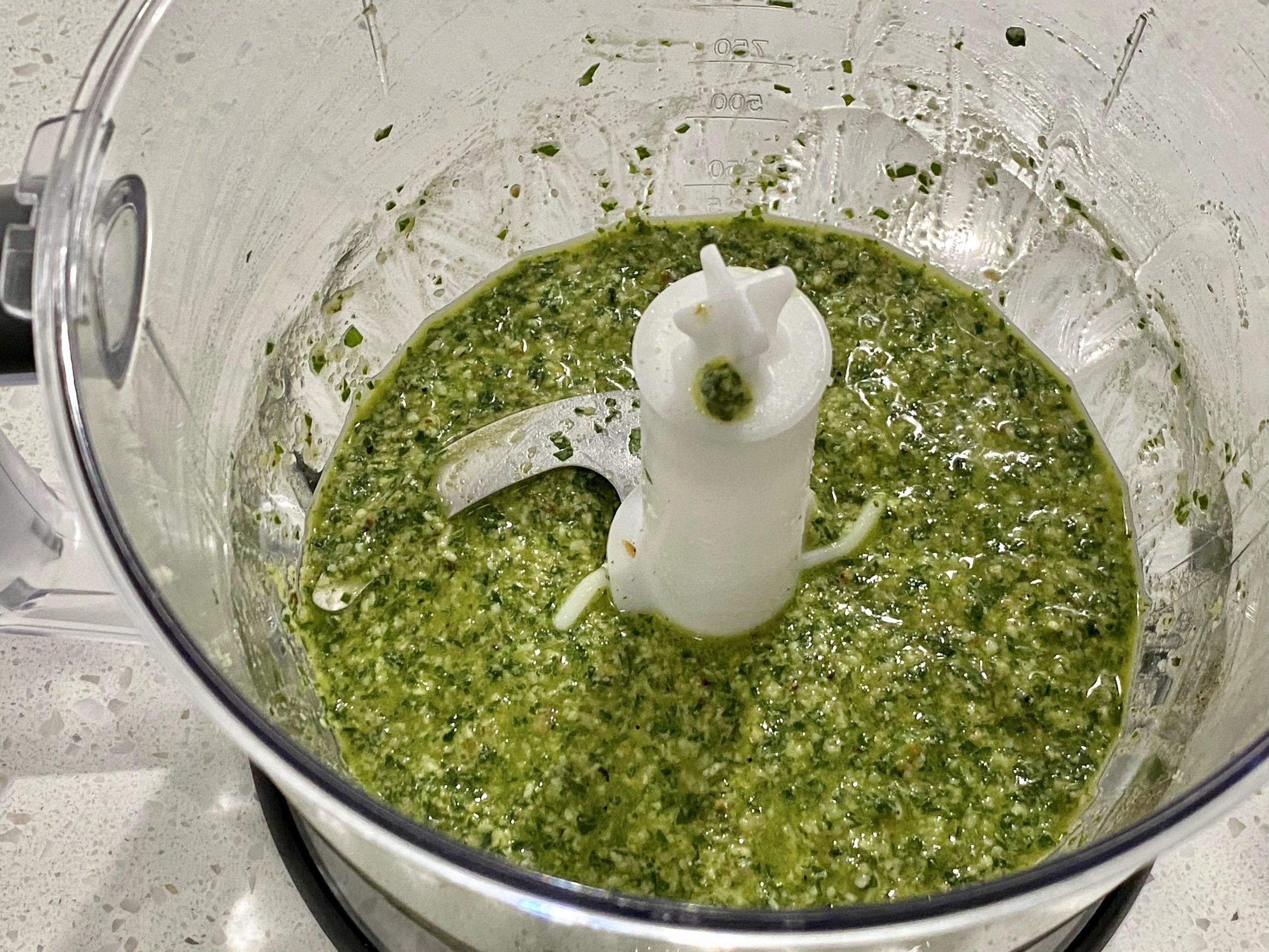 - Slowly pour the olive oil into the mixture while the food processor is running.