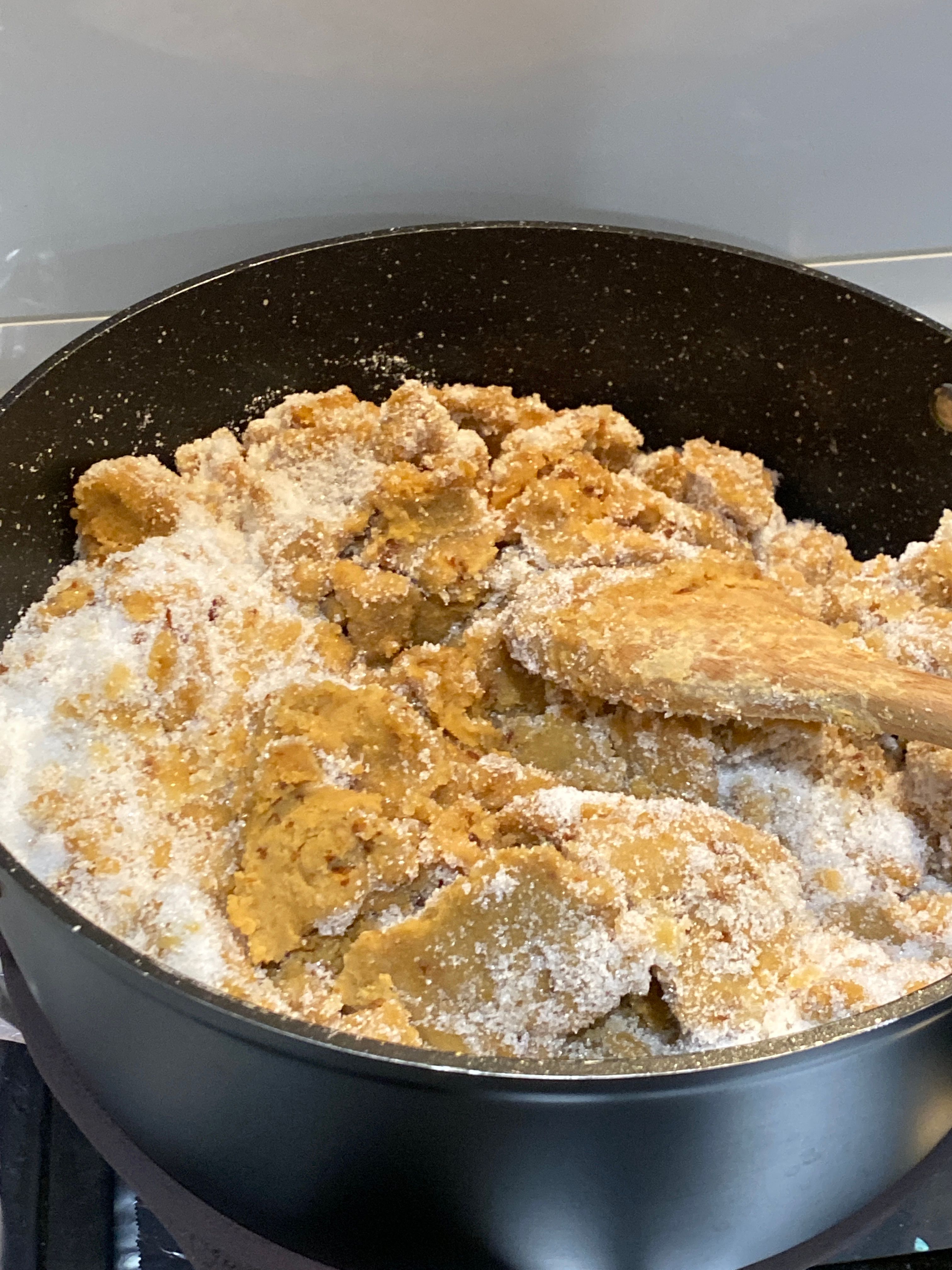 - When all the water dries out, add the sugar. Don’t bother mixing too well at this point. When the sugar melts it’ll make stirring easier.