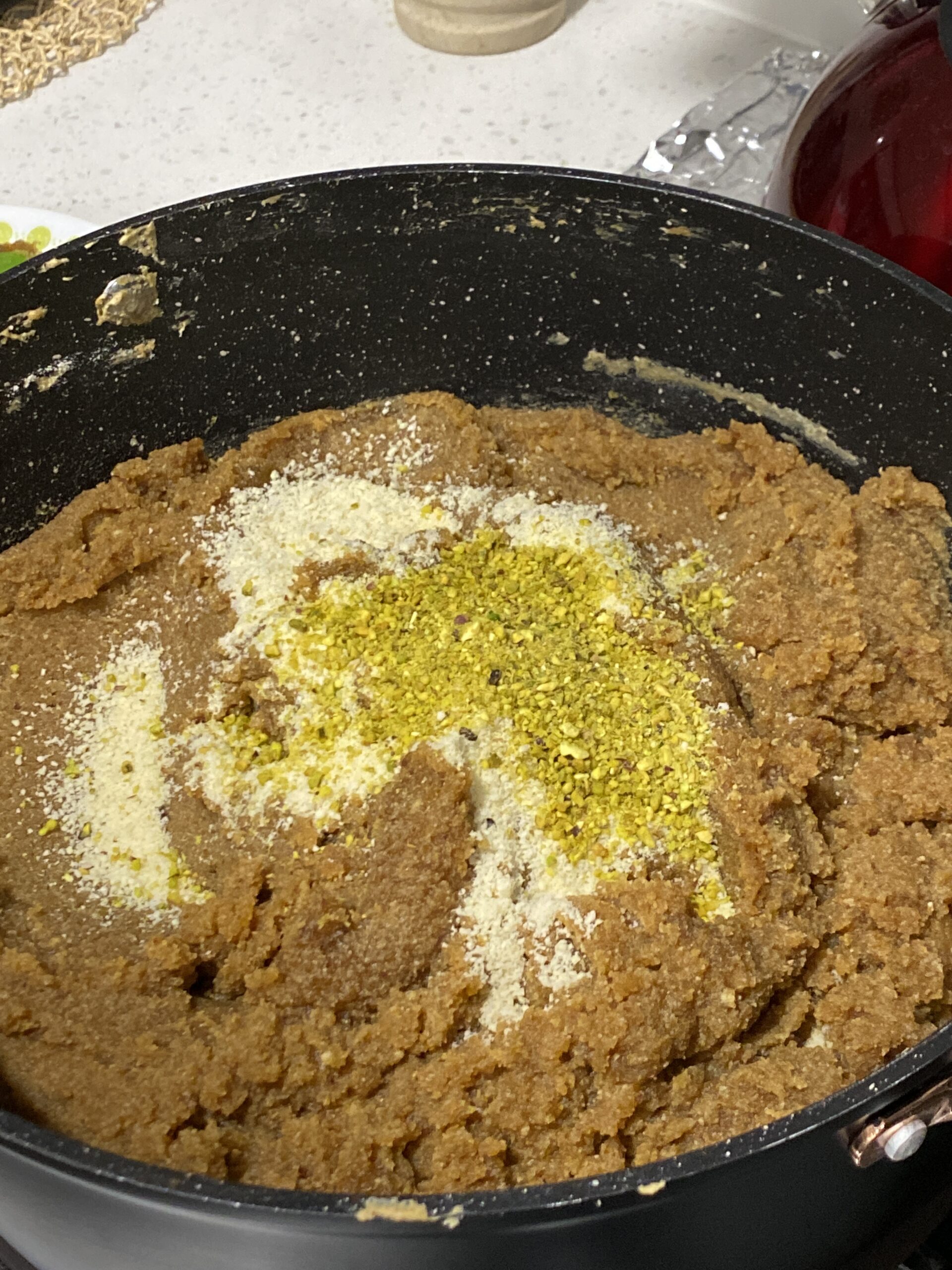 - After 2 hours the halwa will have changed to a darker colour. The sugar water will be drying out. The halwa will look glossy.