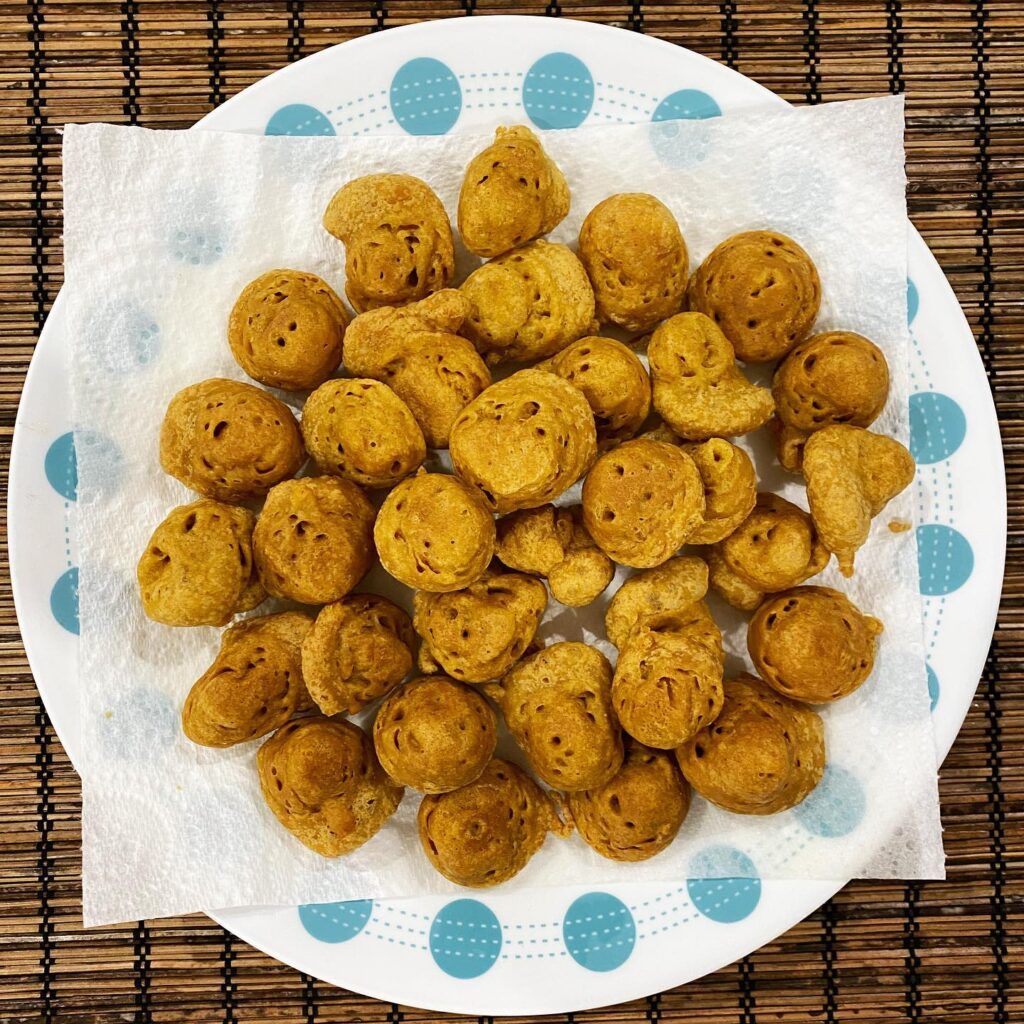 - The phulkis/pakoras should start rising/puffing up almost immediately and tiny air bubbles (almost like Swiss cheese) should form all over it. This means the phulki is cooking well from the inside.