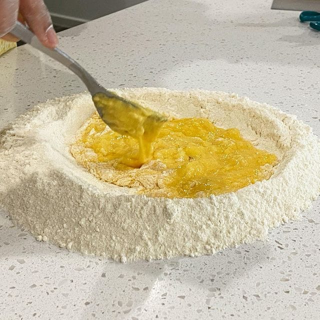 - Use a fork to whisk the eggs and gradually start combining / whisking the flour into the egg mixture.