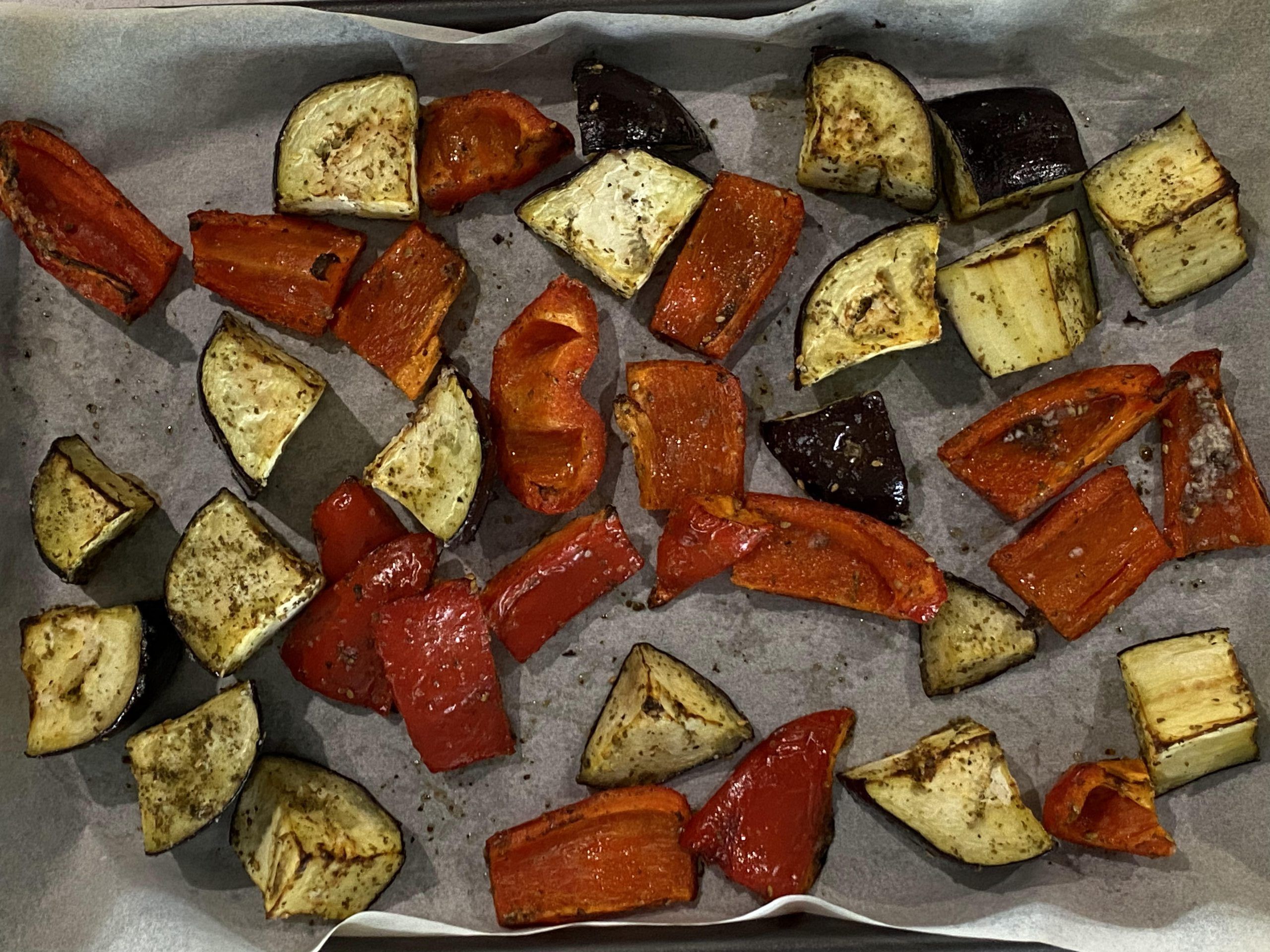 - Cut the eggplant and capsicum into big chunks. Season with salt and zaatar. Drizzle olive oil (don’t be stingy!) and toss to coat evenly.