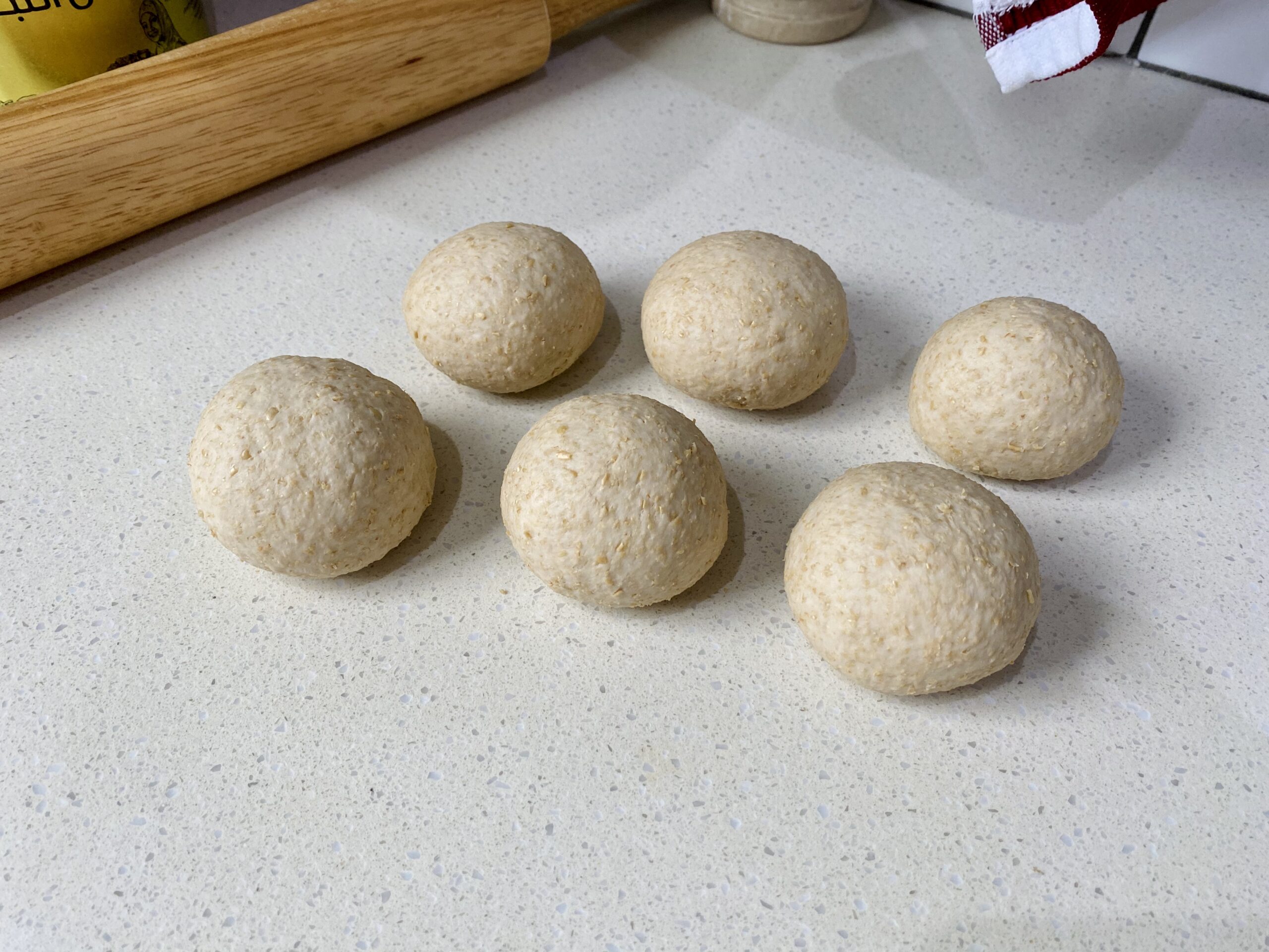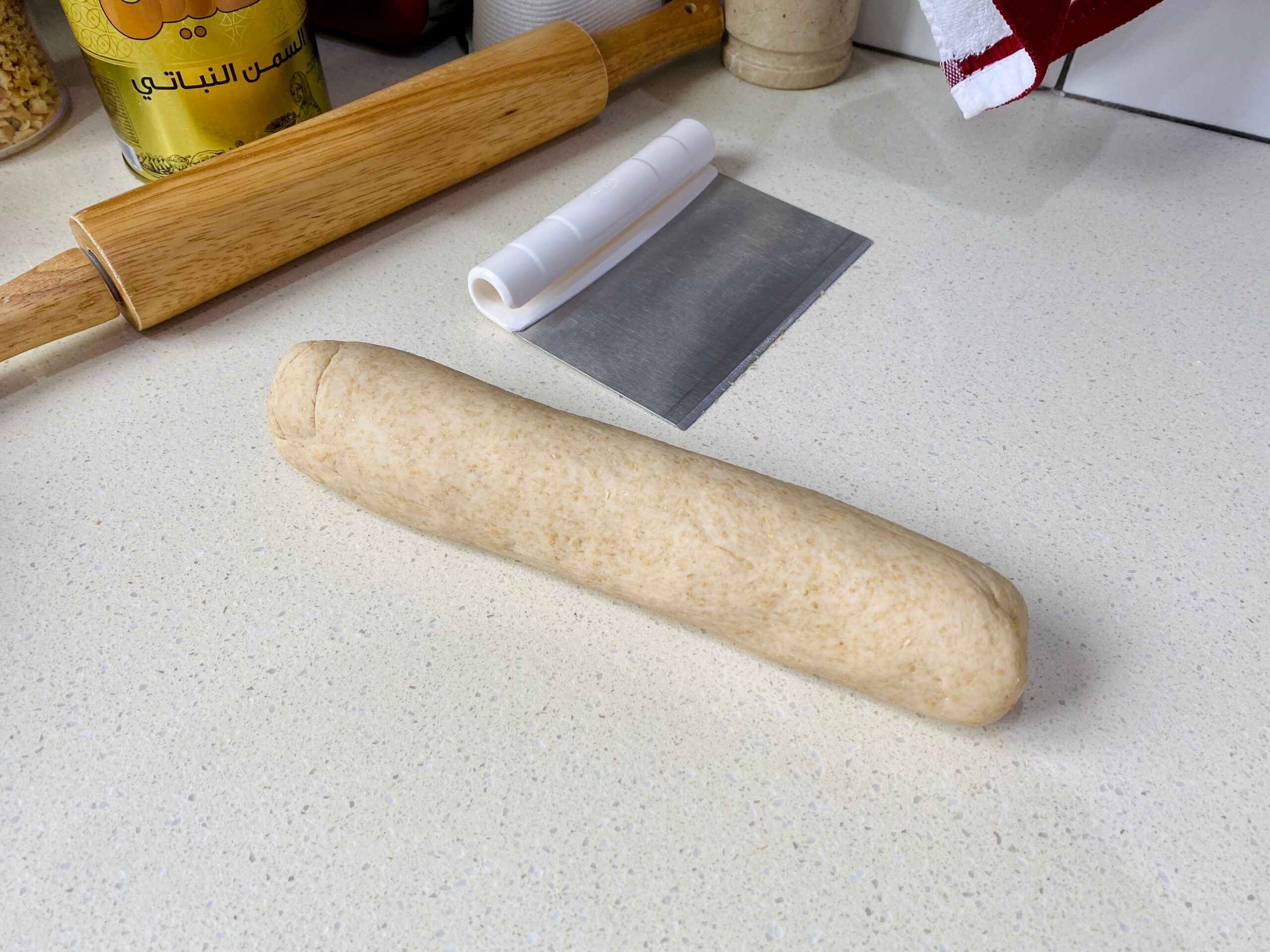 • Roll out the dough into a log and cut into 6 even parts / “pairas”.