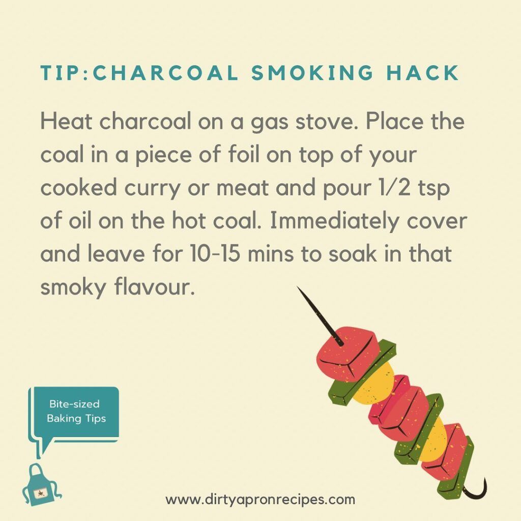 Take a small piece of charcoal (the real thing, not the brick type you get at the grocery) and heat it up on a gas stove. This will take roughly 10 mins. Shape a piece of foil into a bowl and place it at the centre of the cooked meat / curry (you don’t need the heat on for this). Using tongs place the hot coal into the foil. Pour about 1/2 tsp of oil on the coal. This will release smoke so you’ll need to immediately place a lid on the pan to seal the smoke. After about 15 mins you can remove the coal and enjoy your nice smoky meal 😃 You’d be surprised what a difference this little trick makes to the flavour. It just elevates it to the next level!